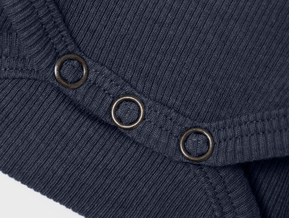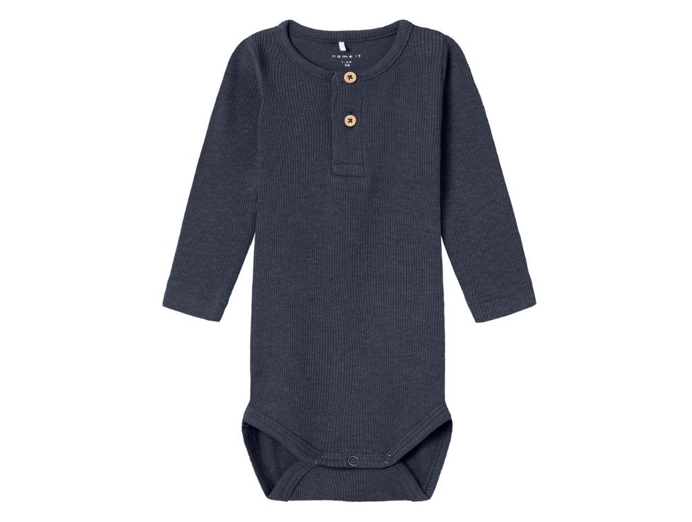 Ribstrikket body i mørkeblå nuance fra Name It. Bodyen har lange ærmer, rund hals og små træknapper foran, som giver et klassisk og enkelt udtryk. Den bløde og strækbare kvalitet gør den behagelig for barnet og ideel til brug året rundt.