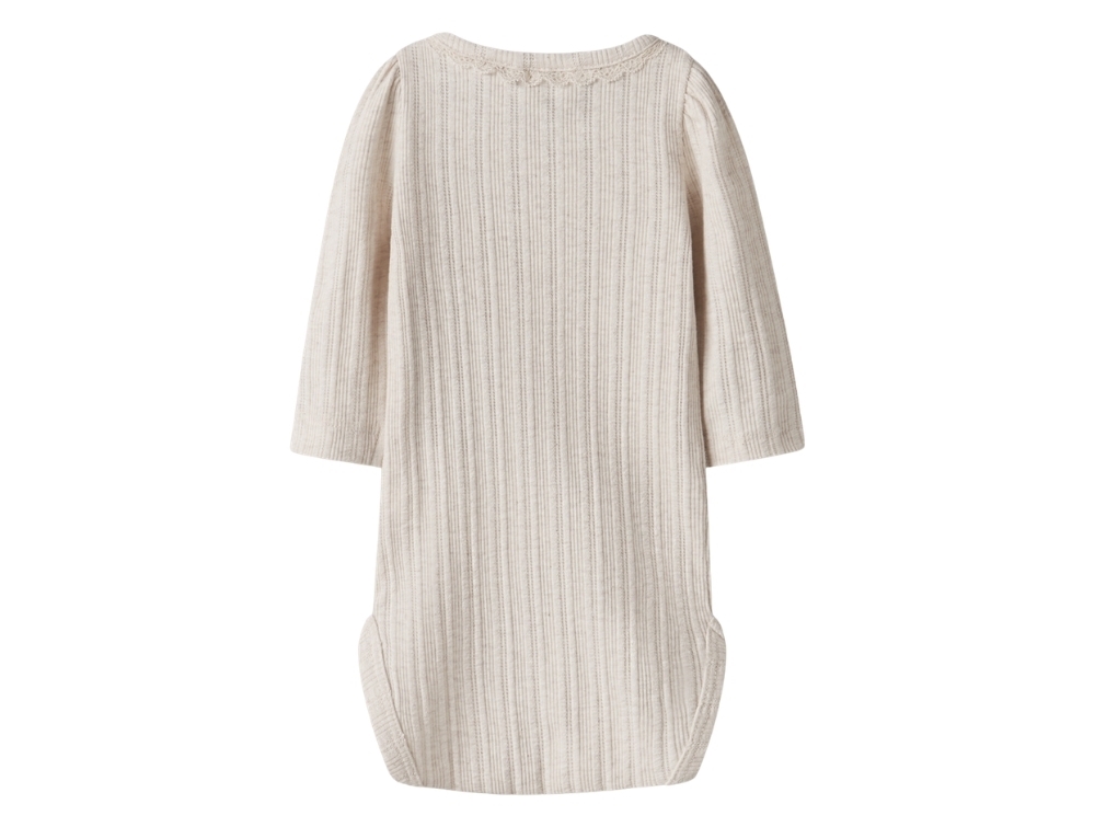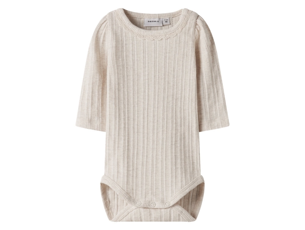 Name It body i beige nuance peyote melange med hulmønsterName It body i beige nuance peyote melange med blondekant ved halsName It body i beige nuance peyote melange med trykknapper