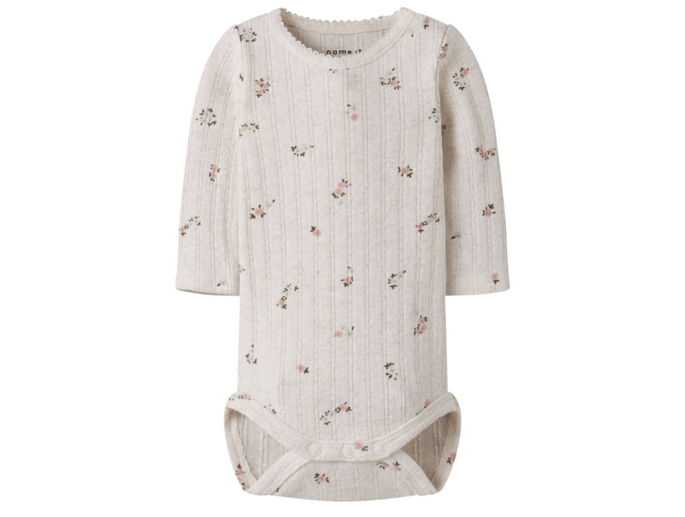 Body i råhvid nuance fra Name It med små blomsterprint over hele stoffet. Den fine pointelle-struktur giver et sødt og feminint udtryk, mens materialet føles blødt mod babyens hud.