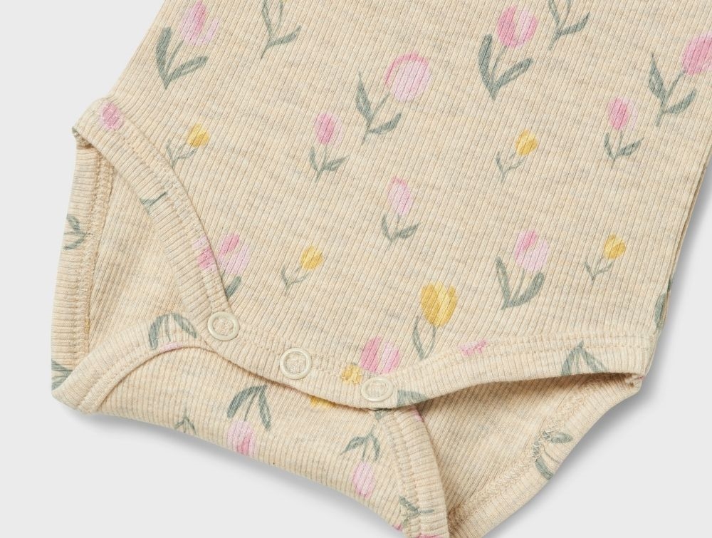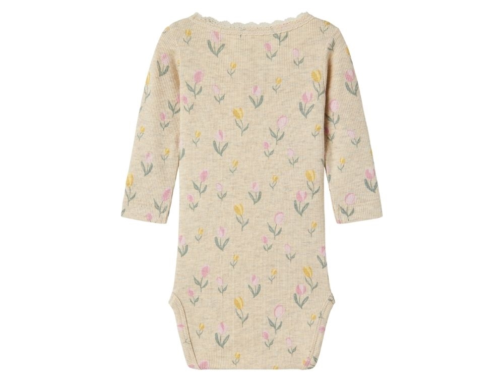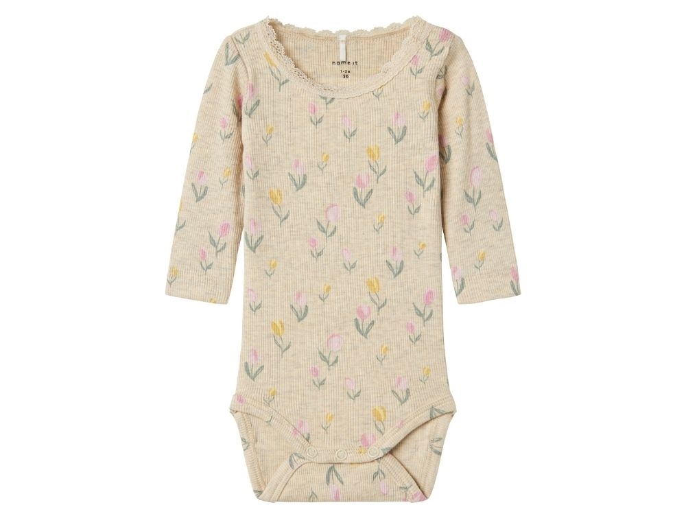 Body i varm beige nuance fra Name It med blomsterprint i pastelgul og rosa.