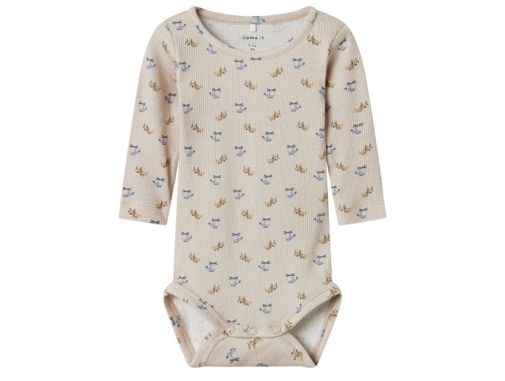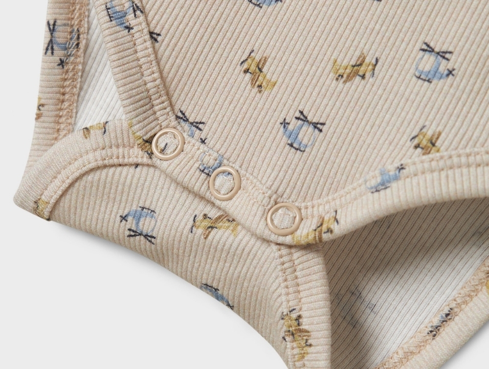 Body i beige nuance fra Name It med fint helikopterprint. Den bløde jersey med stræk sikrer en behagelig pasform og god bevægelsesfrihed til baby.