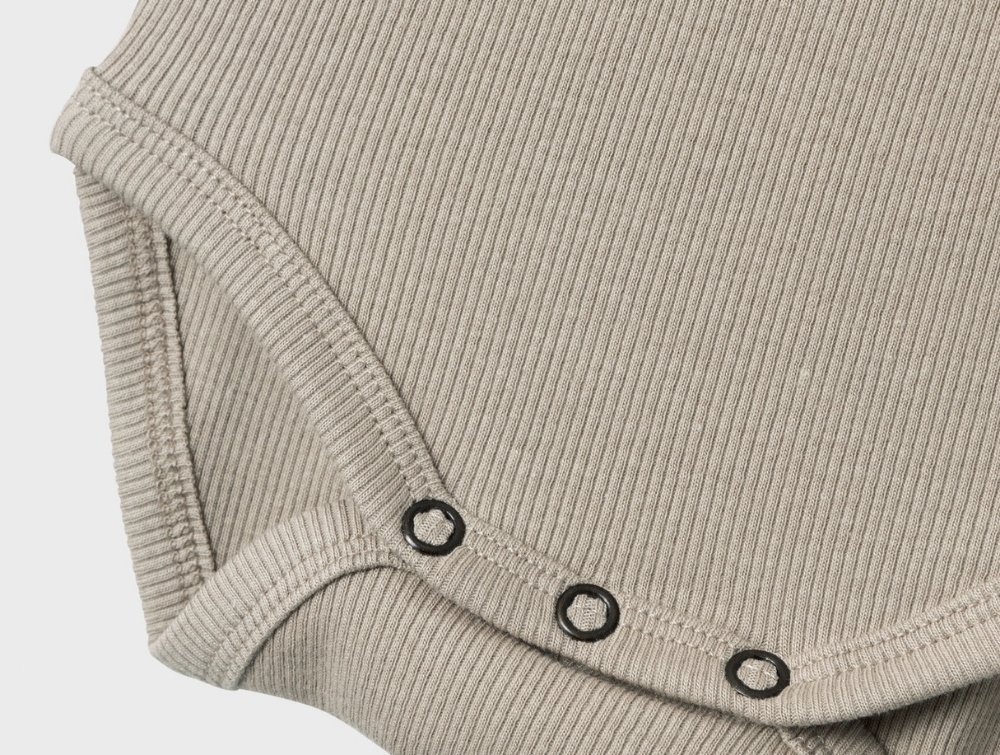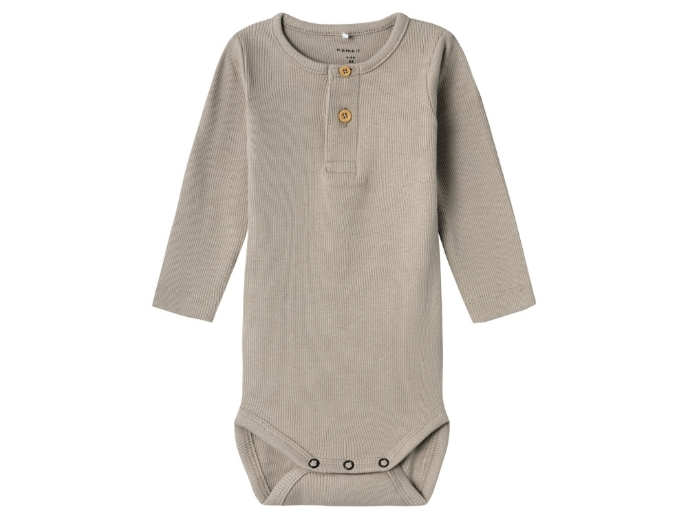 Ribstrikket body i lys beige nuance fra Name It. Bodyen har lange ærmer, rund hals og to små træknapper foran, der giver et naturligt og klassisk udtryk. Den bløde og strækbare kvalitet føles behagelig mod barnets hud og gør den ideel til hverdagsbrug.