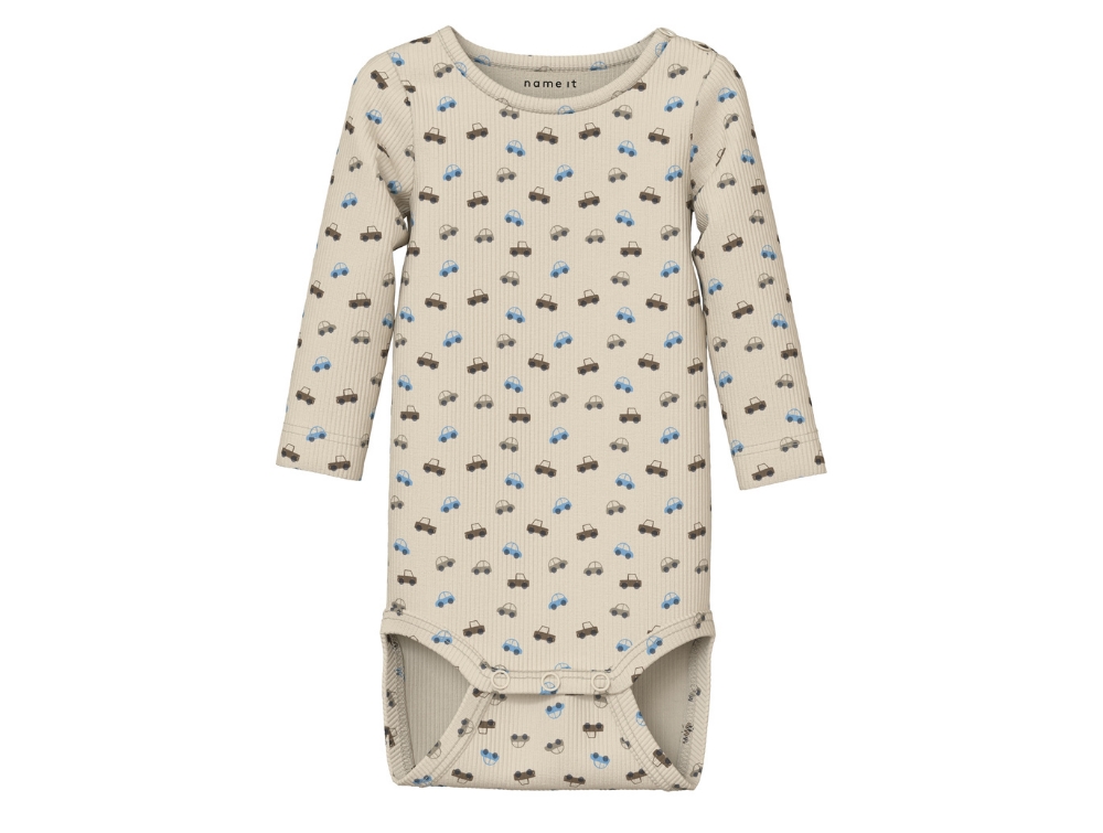 Råhvid langærmet body med print af biler fra Name It 13240587 summer sandTrykknaplukning i råhvid langærmet body med print af biler fra Name It 13240587 summer sand