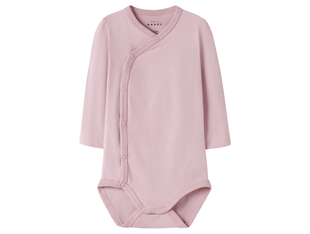 Body i lys rosa nuance (burnished lilac) fra Name It med praktisk slå-om lukning. Modellen har lange ærmer og trykknapper foran og forneden, som gør det let at skifte barnet.