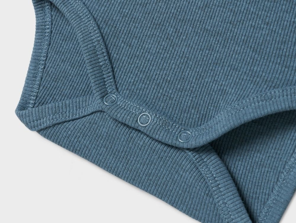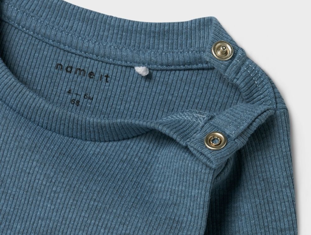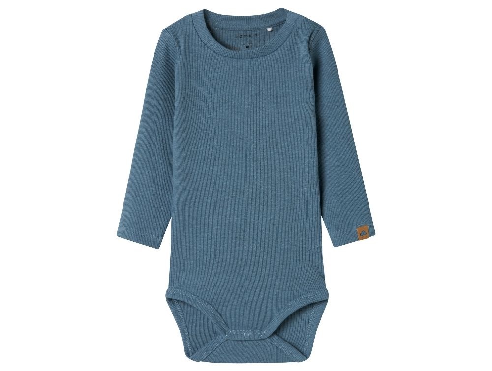 Blød og behagelig langærmet body fra Name It i en meleret blå nuance. Den ribstrikkede kvalitet giver god elasticitet og komfort, så barnet kan bevæge sig frit.