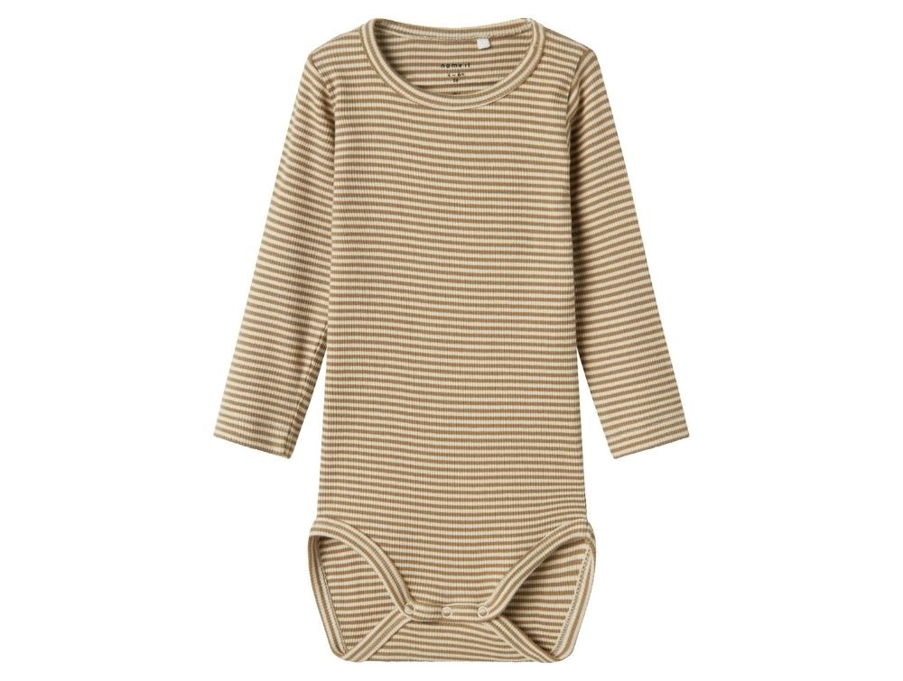 Blød og praktisk langærmet body fra Name It i en klassisk stribet kombination af råhvid og brun. Bodyen er lavet i en strækbar ribkvalitet, der sikrer en behagelig pasform og god bevægelsesfrihed.