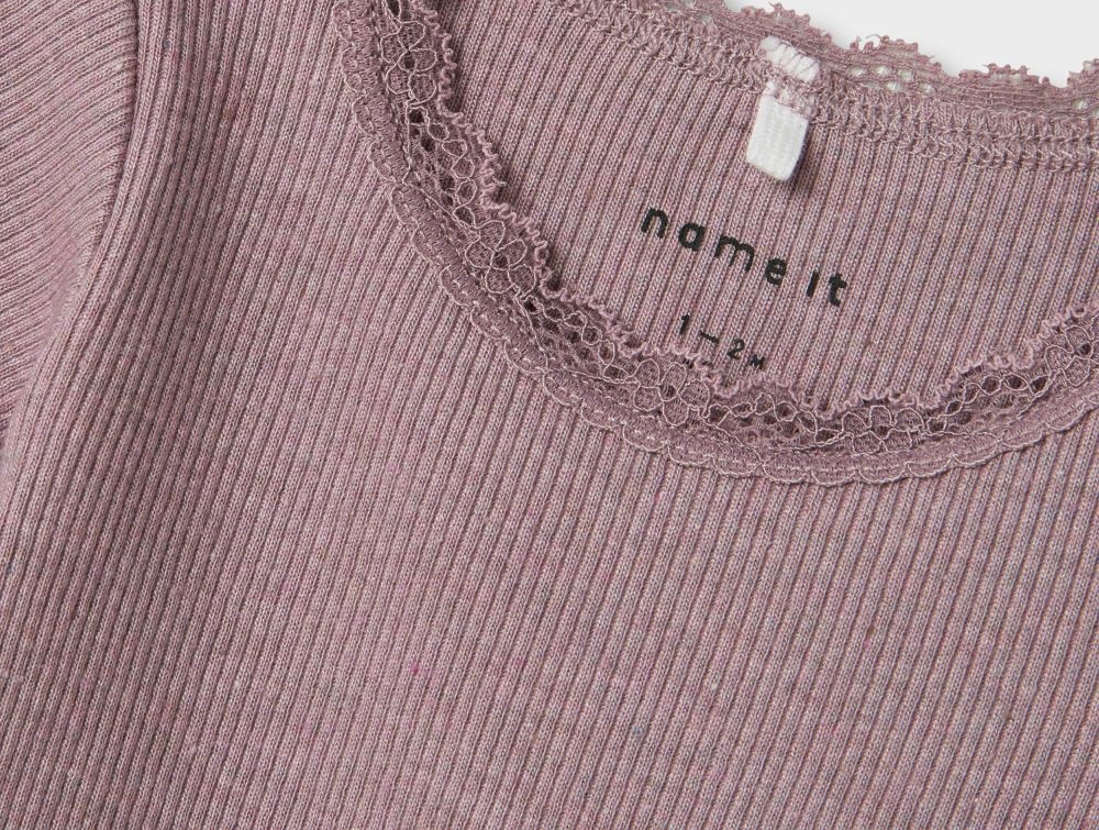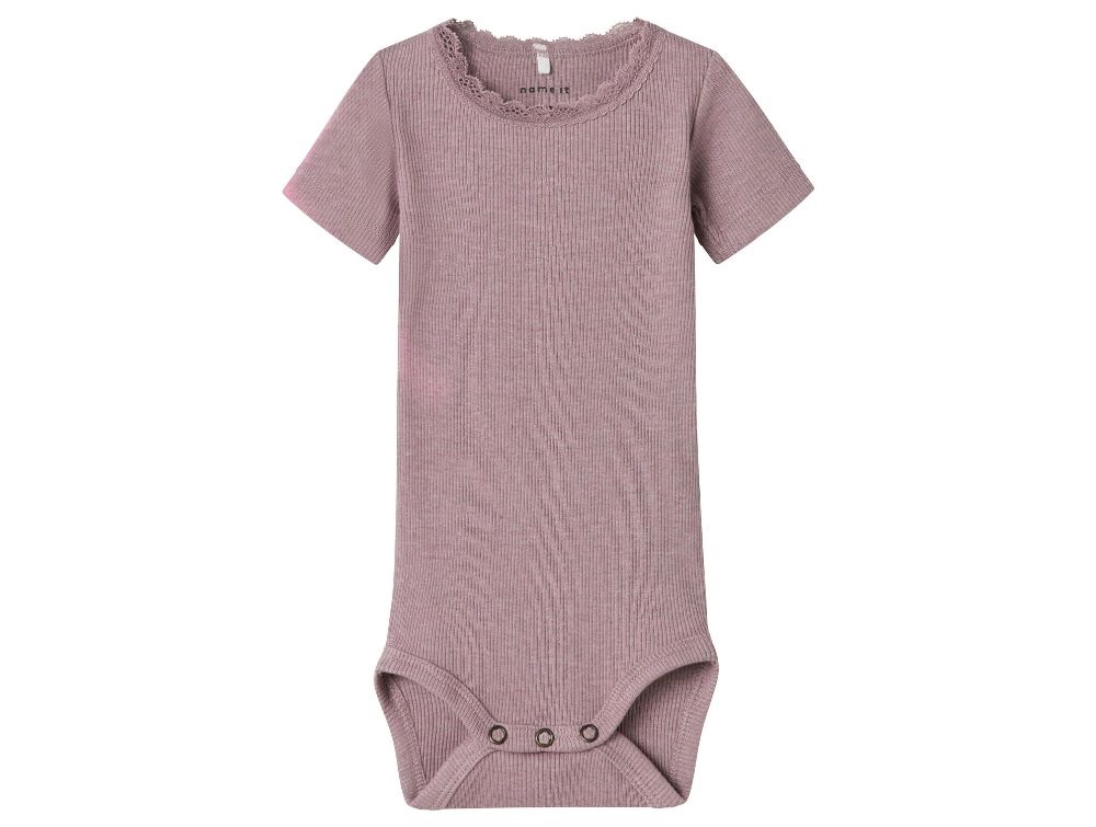 Blød og behagelig kortærmet bodystocking fra Name It i en meleret violet nuance. En fin blondedetalje ved halsudskæringen tilfører et feminint og elegant touch.