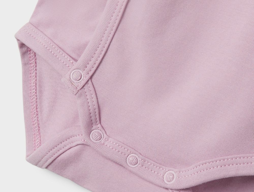 Blød og praktisk wrap-body i en smuk rosa nuance. Modellen har lange ærmer og lukkes med trykknapper langs maven og forneden, hvilket gør den nem at tage af og på – især praktisk til de mindste.
