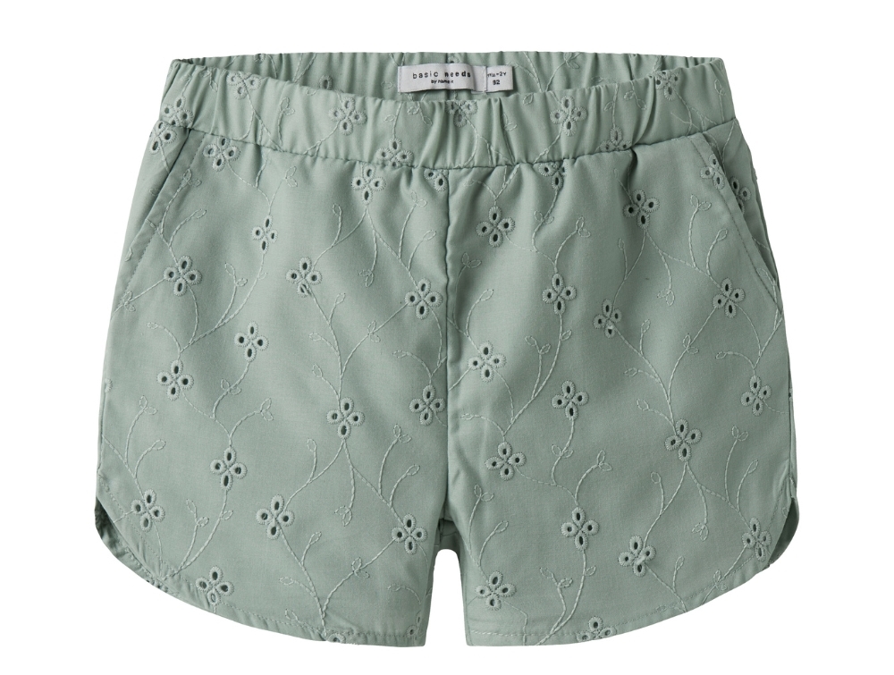 Shorts i grøn nuance (aqua gray) fra Name It. Let vævet kvalitet med broderet blomsterstruktur og afrundede benkanter.