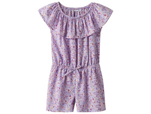 Let og luftig buksedragt fra Name It i smukke lilla nuancer med et dekorativt sprinkle-print. Modellen har et afslappet og feminint udtryk med off-shoulder-design og fine blondedetaljer.