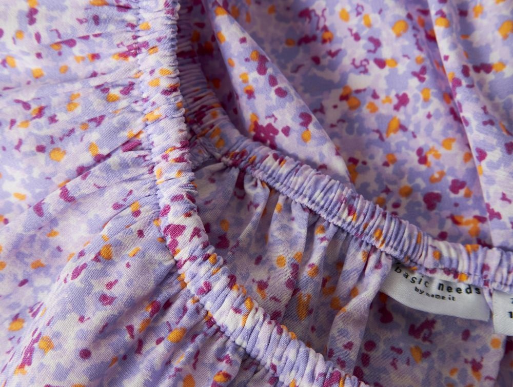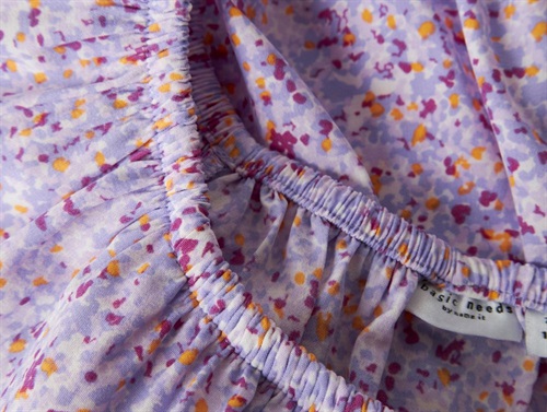 Let og luftig buksedragt fra Name It i smukke lilla nuancer med et dekorativt sprinkle-print. Modellen har et afslappet og feminint udtryk med off-shoulder-design og fine blondedetaljer.