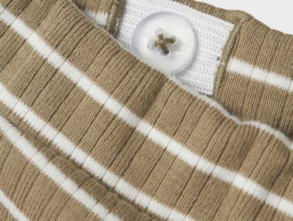 Fremstillet i en blød kvalitet af økologisk bomuld og elastan, som sikrer fleksibilitet og behagelig pasform. Et par klassiske stribede bukser, perfekte til hverdag og leg.