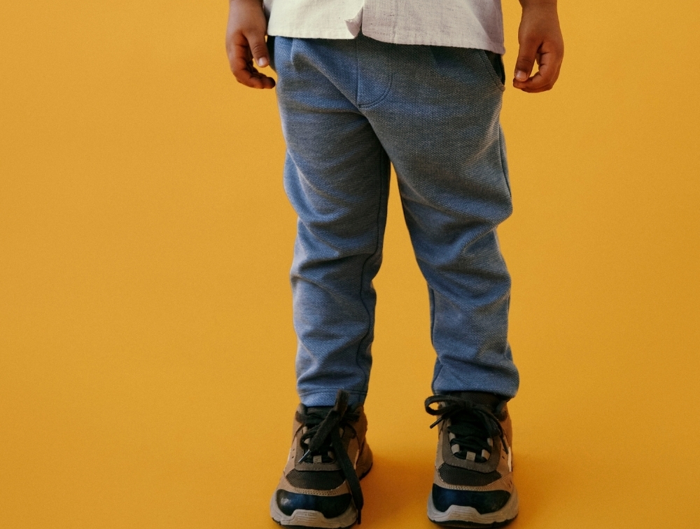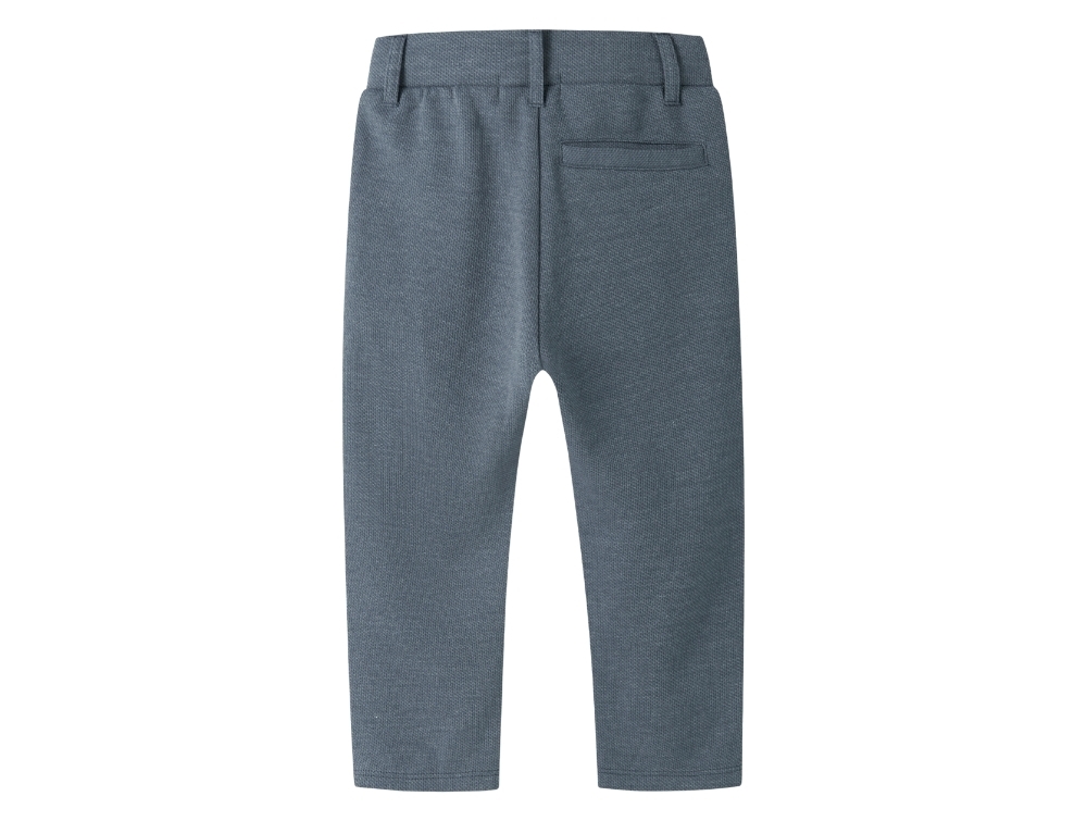 Materialet har en let struktur, som giver bukserne et roligt udtryk. Modellen har lommer i siden, dekorativ baglomme samt justerbar talje, så pasformen kan tilpasses barnet.
