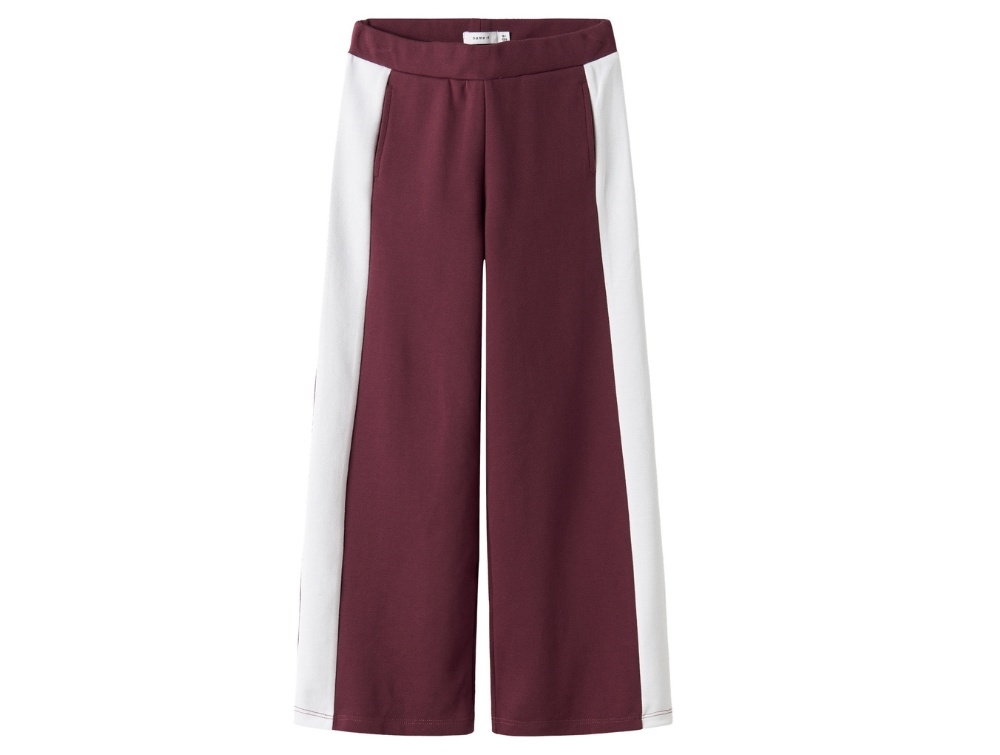Bukser i mørkerød nuance fra Name It. Modellen har brede ben, elastik i taljen og en kontrastfarvet stribe langs siden.