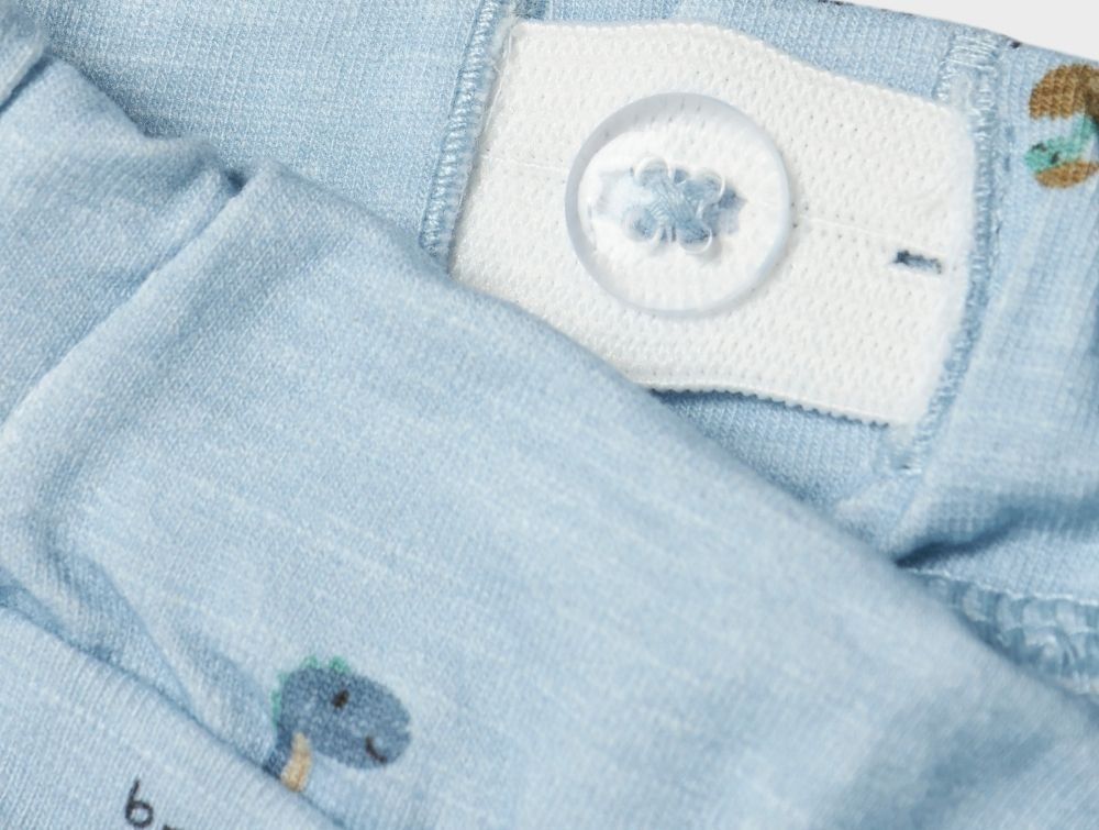 Bløde og strækbare bukser i en lys blå nuance med et sødt dinosaurprint. Bukserne har en behagelig pasform med elastik i taljen, der sikrer god komfort og bevægelsesfrihed. Jersey-kvaliteten er let og blød mod huden, hvilket gør dem perfekte til hverdagsbrug.