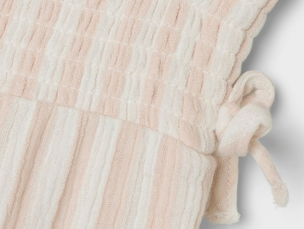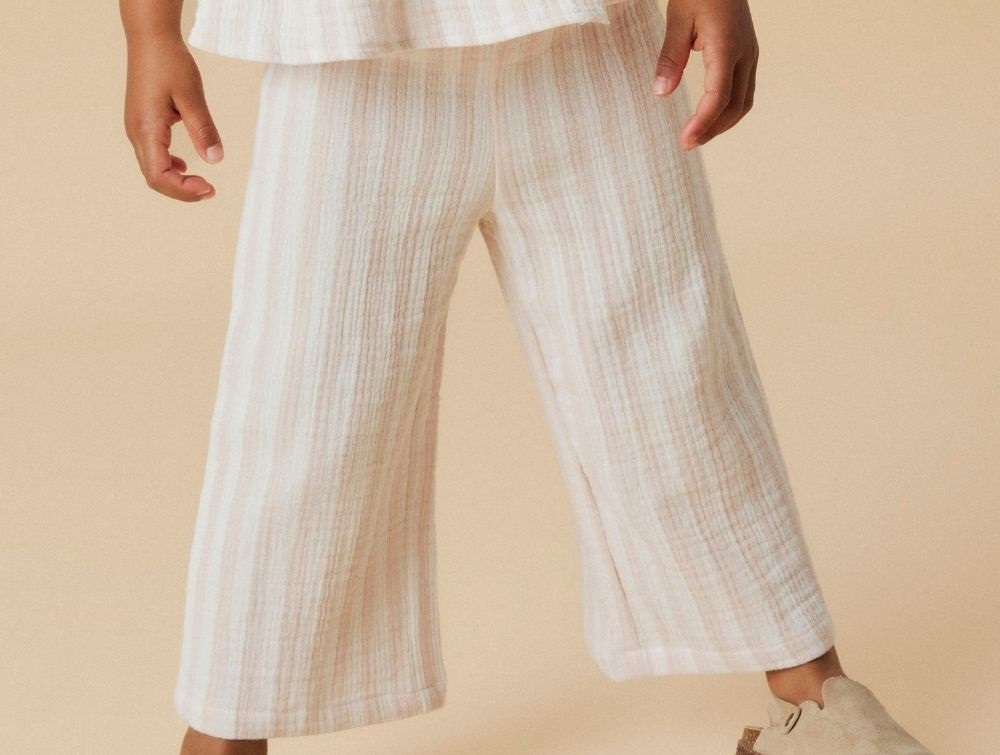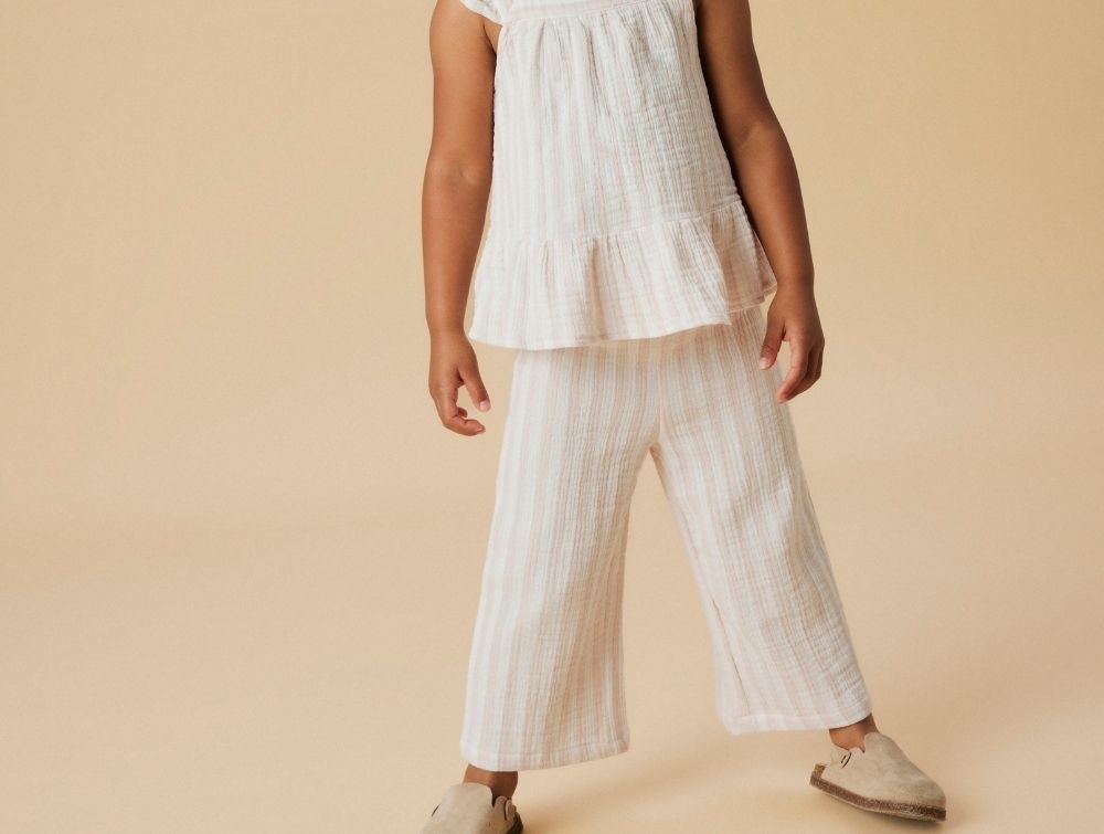 Disse bukser er lavet i 100% økologisk bomuld og har en løs pasform med brdde ben og en tætsiddende overdel. De har elastik i taljen og en lille sløjfedetalje i siden, som giver et fint udtryk.