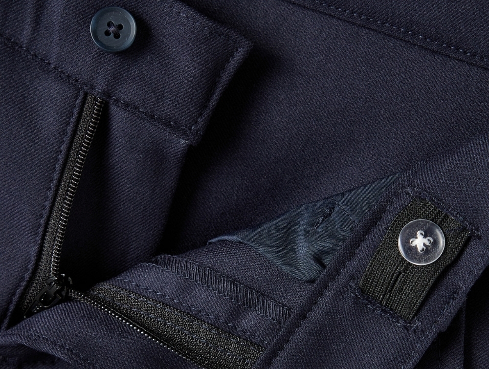 Designet har knap- og lynlåslukning samt bæltestropper. Linningen har indvendig justerbar knaphulselastik, som gør det muligt at tilpasse pasformen.