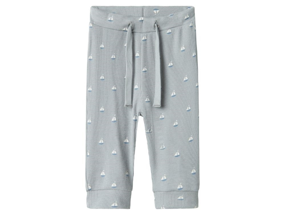 Bløde bukser i blå (quarry) fra Name It med print af både over hele stoffet.