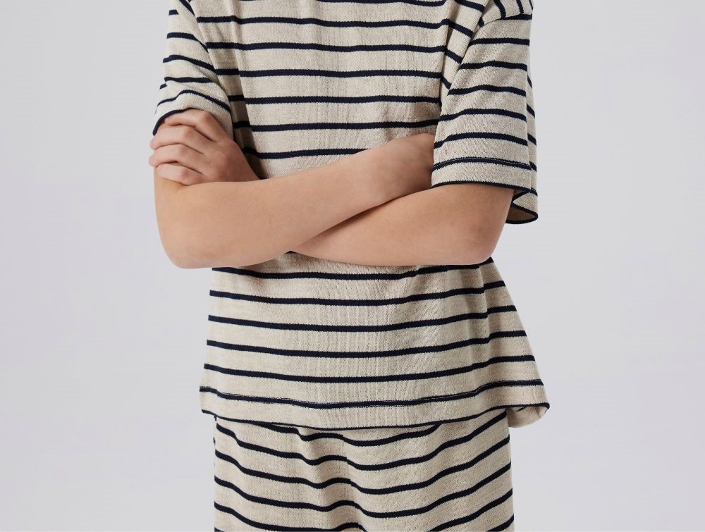 Lette og luftige bukser fra Name It med brede ben og et klassisk stribemønster i sommer sand og navy blazer. Bukserne er lavet af blød viskose, der giver en let og behagelig pasform.