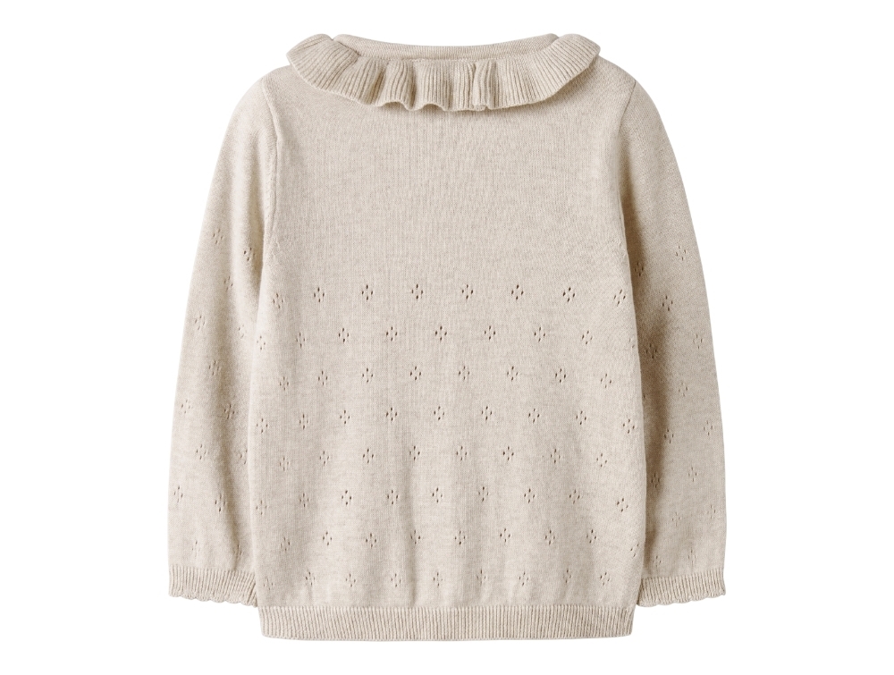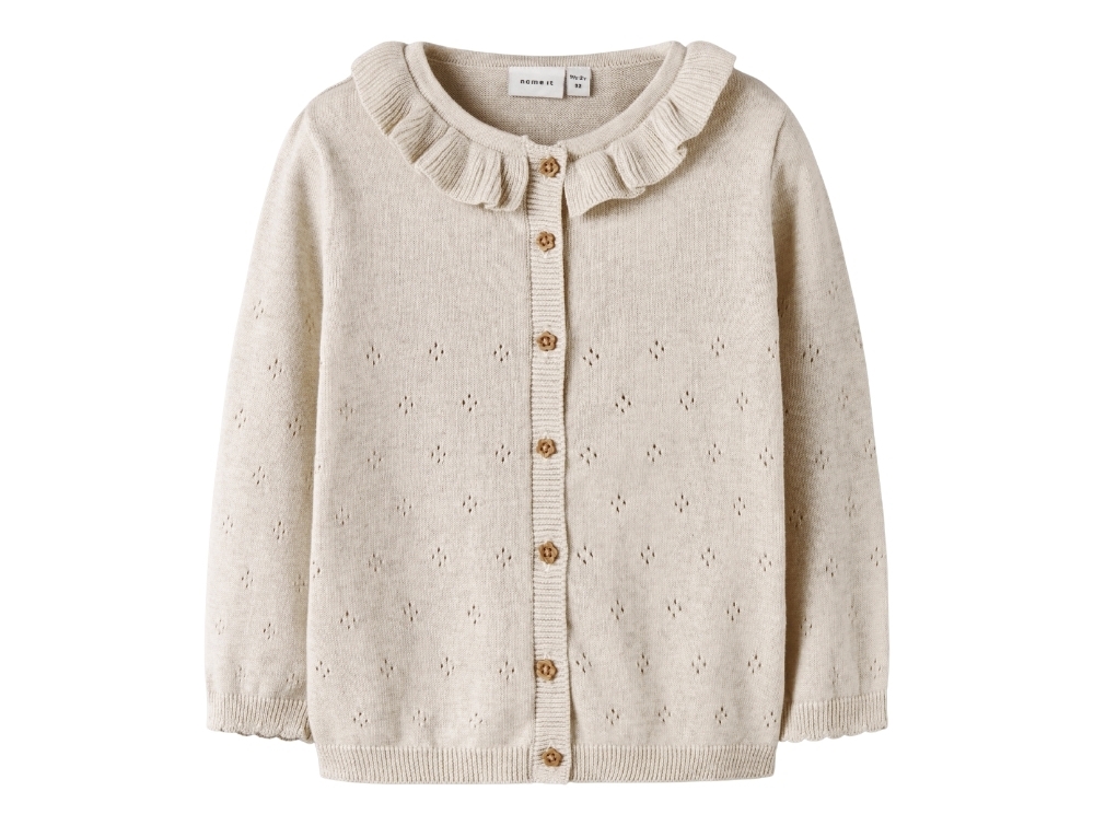 Cardigan i råhvid nuance (Peyote Melange) fra Name It med dekorativ flæsekrave og fint pointelle strikmønster.