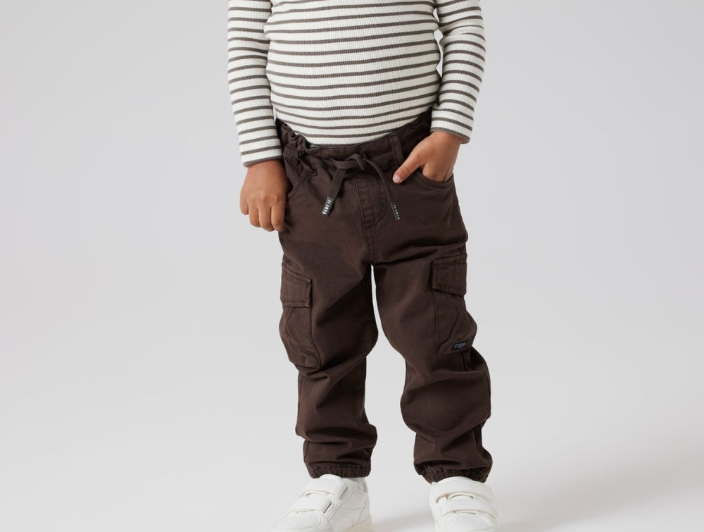 Cargo bukser i mørkebrun nuance fra Name It. Bukserne er lavet i twillvævet kvalitet med elastik i taljen og ved anklerne for en god og behagelig pasform. En praktisk og klassisk style til hverdagsbrug.