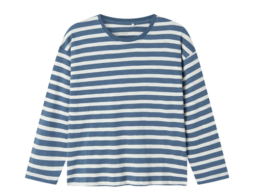 Stribet top i farverne china blue og cloud dancer fra Name It.