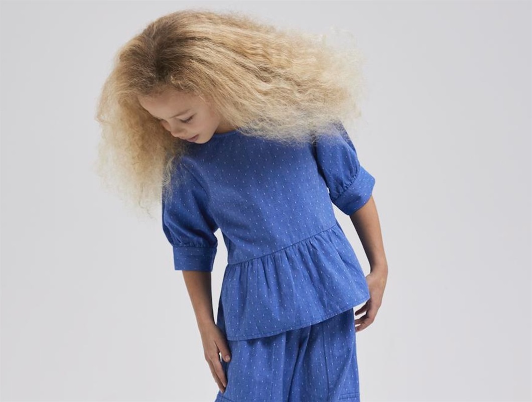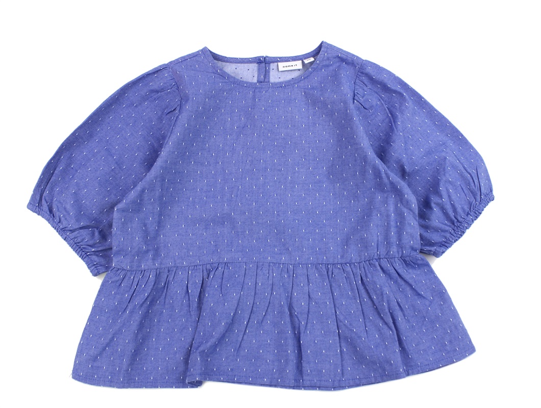 Skøn top i farven clematis blue med hvide prikker og ballonærmer fra Name It.
