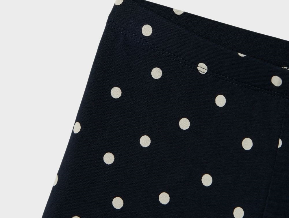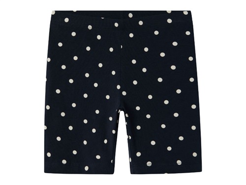 Korte mørkeblå leggings fra Name It i blød og strækbar jersey med polkaprikker.