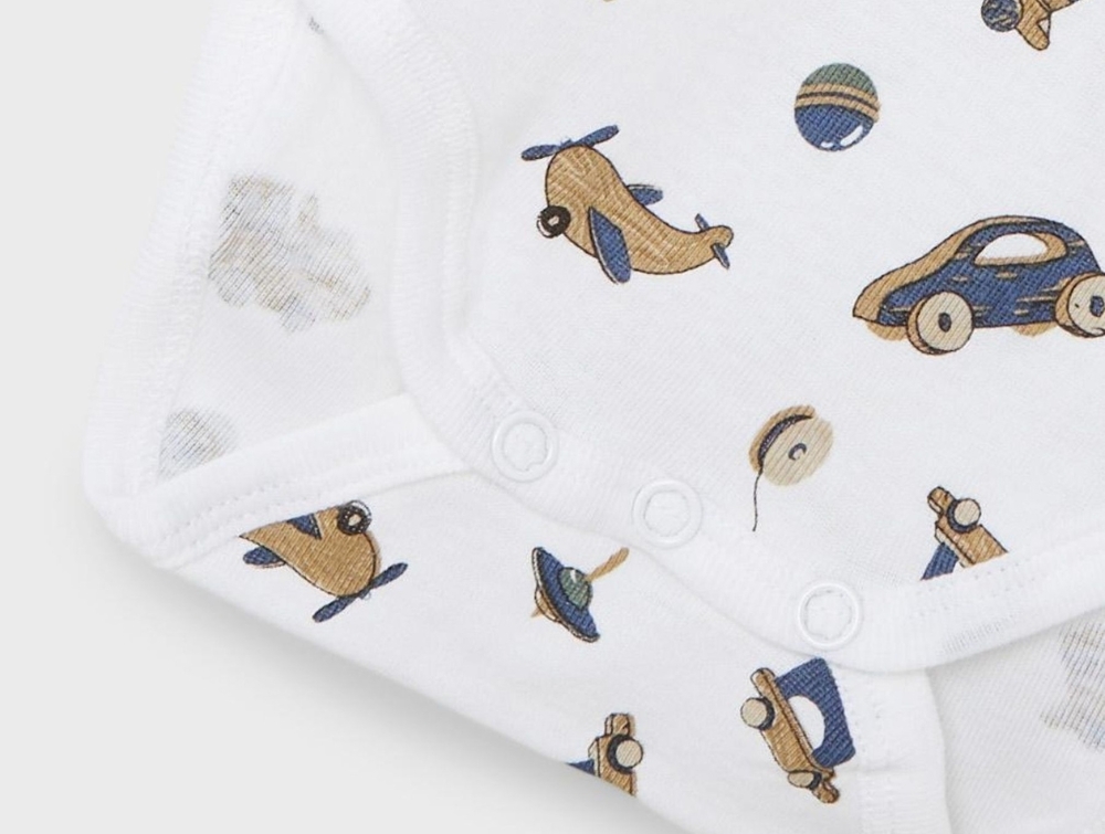 Den blå body er ensfarvet mens de to hvide bodyer har prints af trælegetøj.