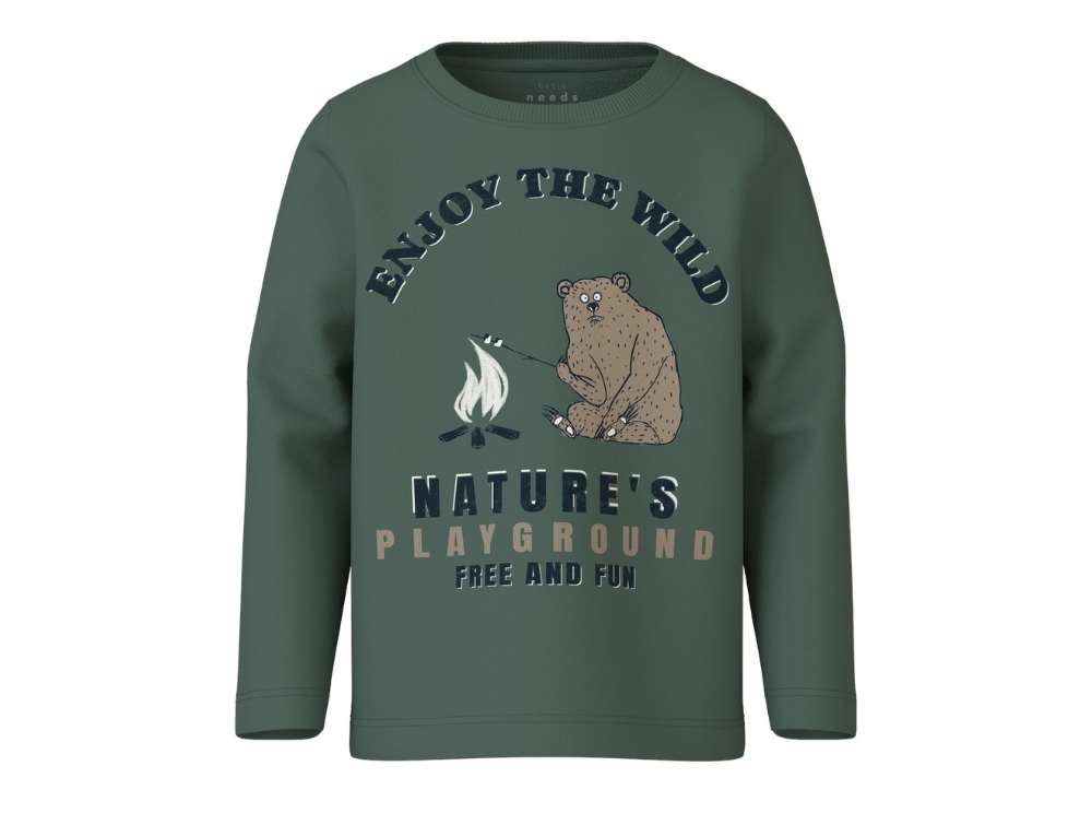 Langærmet top i farven dark forest med 'enjoy the wild' print tema fra Name It.