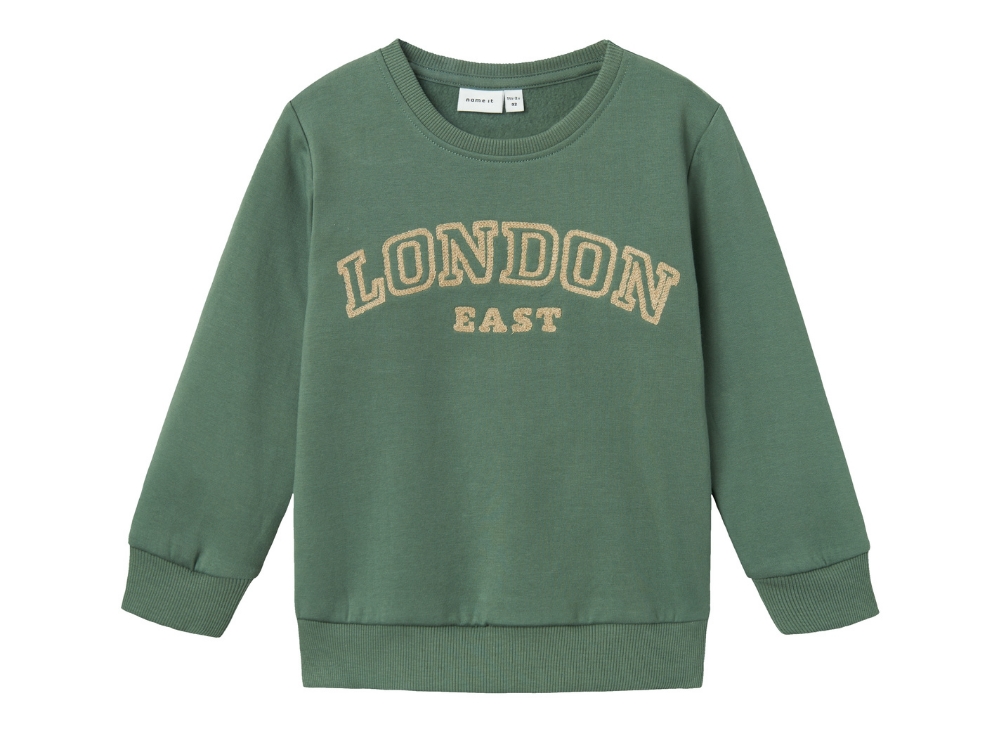 Sweatbluse i farven dark forest med London applikation fra Name It.
