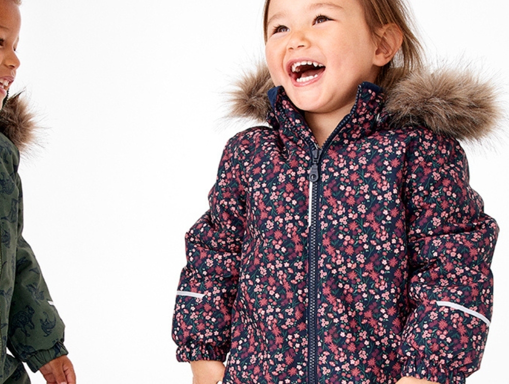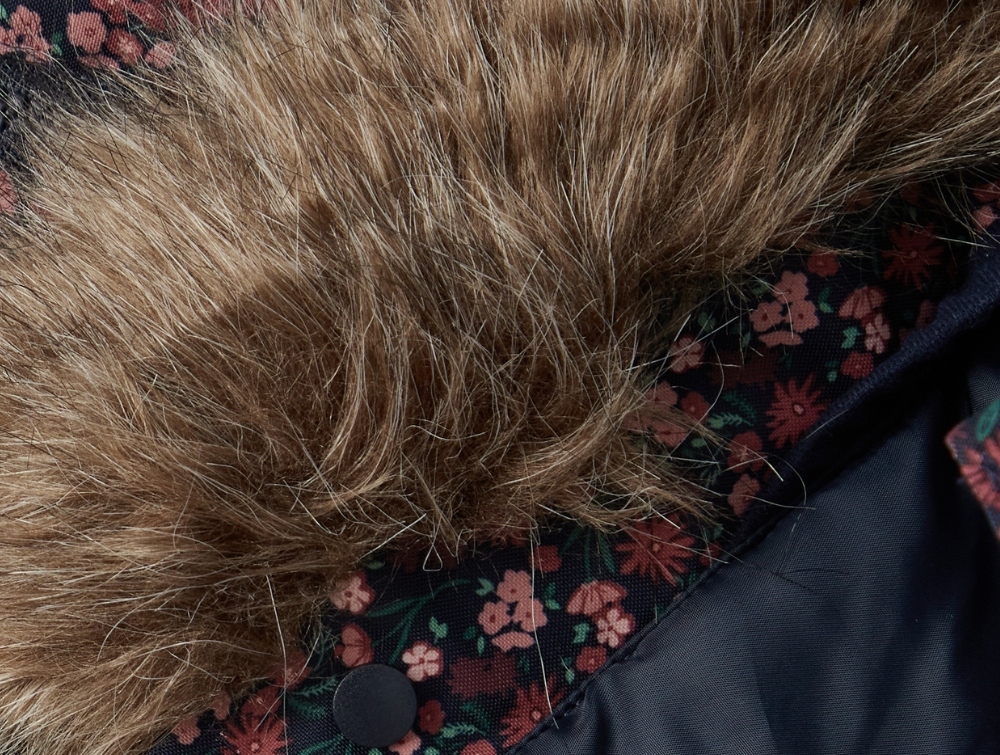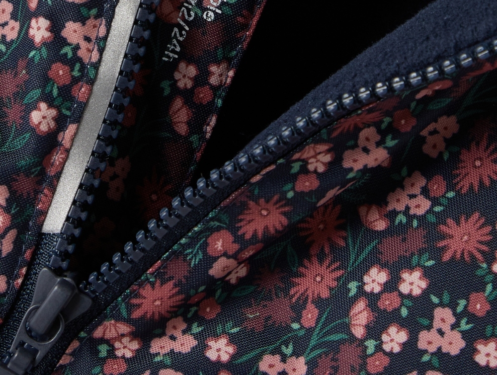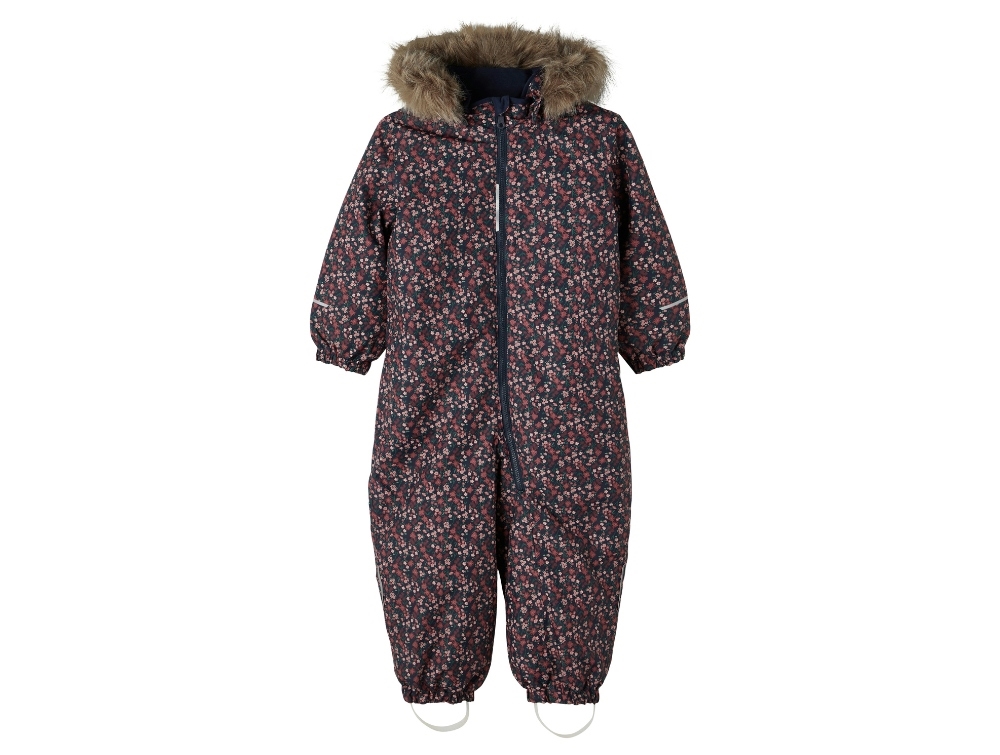 Flyverdragt i farven dark sapphire med blomsterprint fra Name It. Flyverdragten har en aftagelig hætte med faux fur med trykknapper.