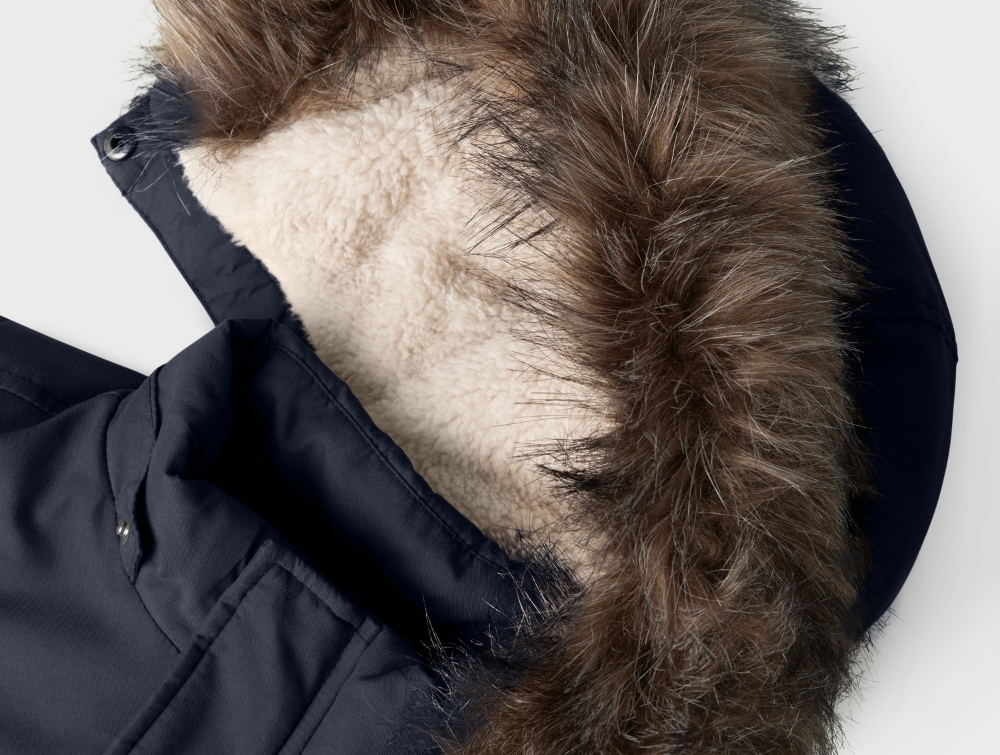 Der er teddyfor i hætten og aftagelig faux fur. Jakken har to lommer med trykknapper og én med lynlås. Den er vindtæt, vandafvisende (5.000mm), åndbar (3000g/m2/24h) og har en slidstyrke på 40.000 Martindale.