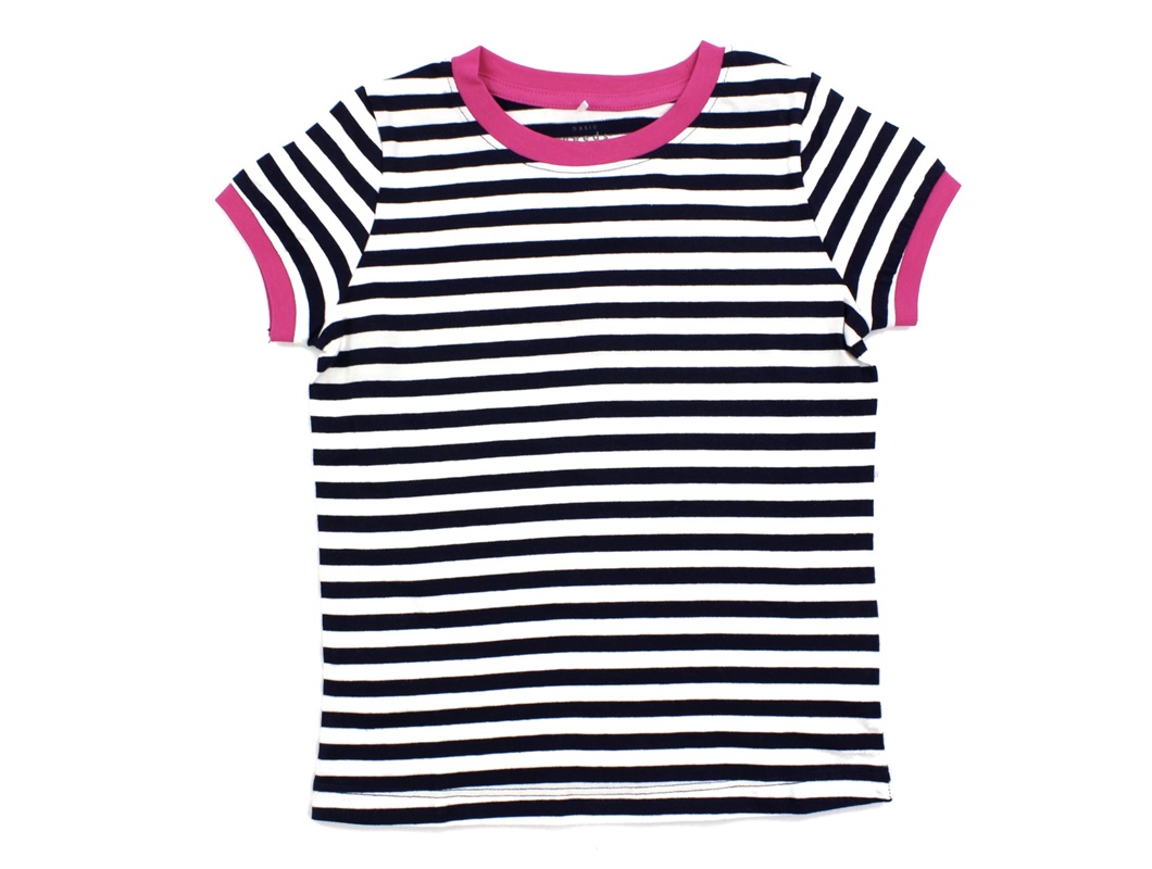 Top i farven dark sapphire med striber og pink detalje i ærmer og halsåbning fra Name It.