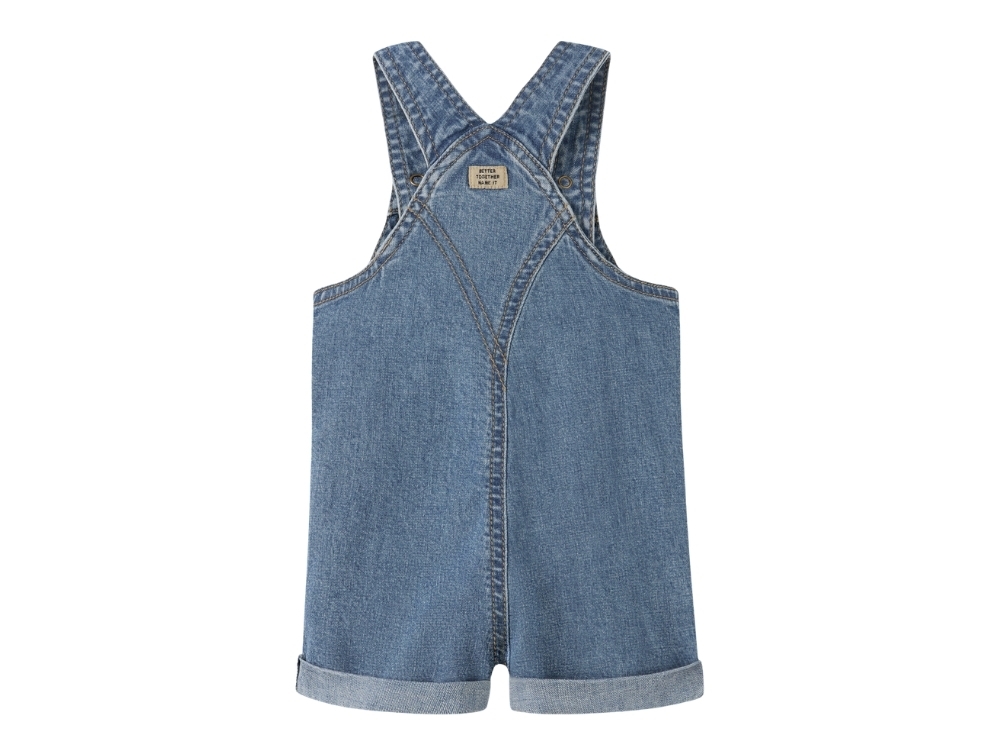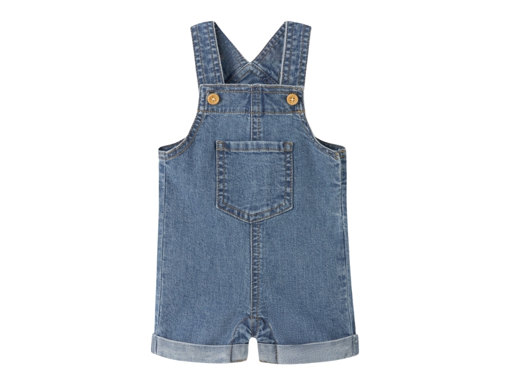Name It denim overalls shorts i blå nuance med brystlommeName It denim overalls shorts i blå nuance detalje med stropper og knapName It denim overalls shorts i blå nuance bagfra