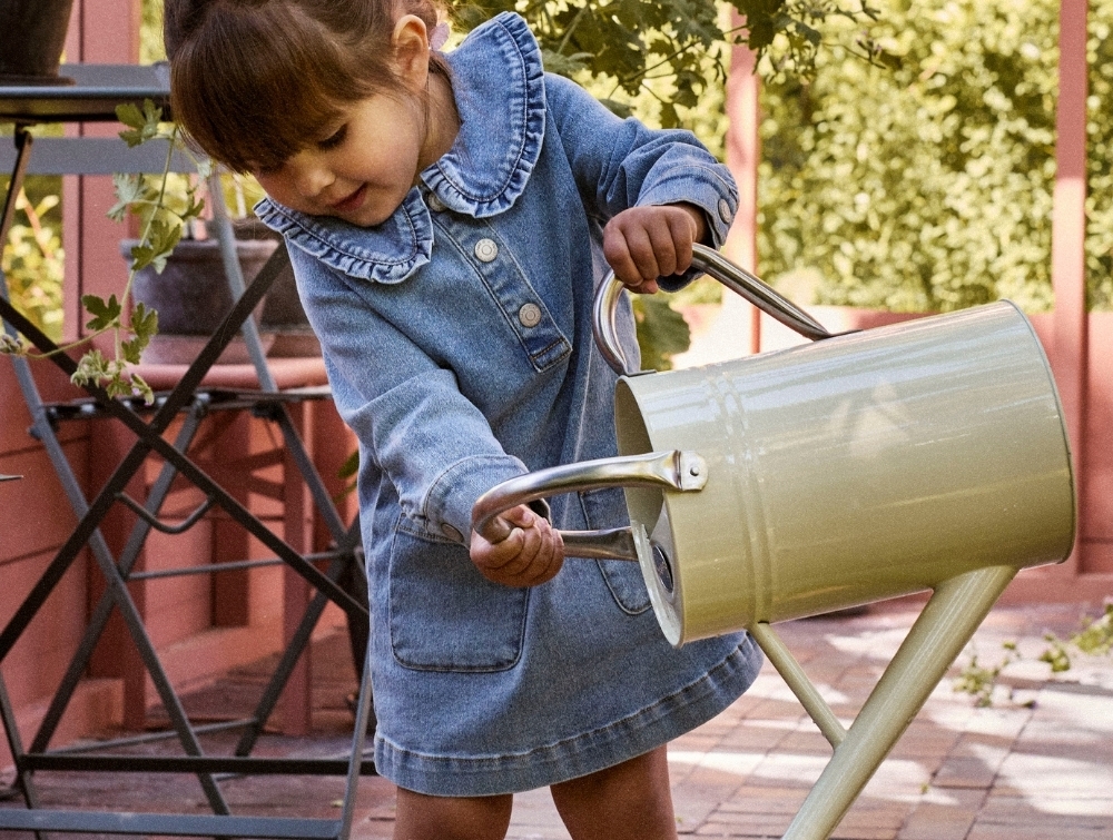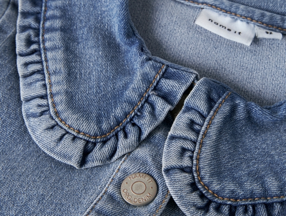Denimkvaliteten giver et klassisk udtryk, mens kraven med flæsedetalje tilfører et dekorativt element.
