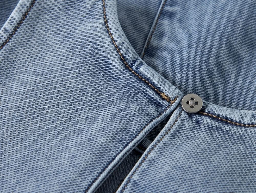 Modellen er fremstillet i vævet denim med let struktur og diskrete slid-effekter, som giver et klassisk udtryk. Materialeblandingen med bomuld, genanvendt bomuld og elastan giver en behagelig kvalitet med let stræk.