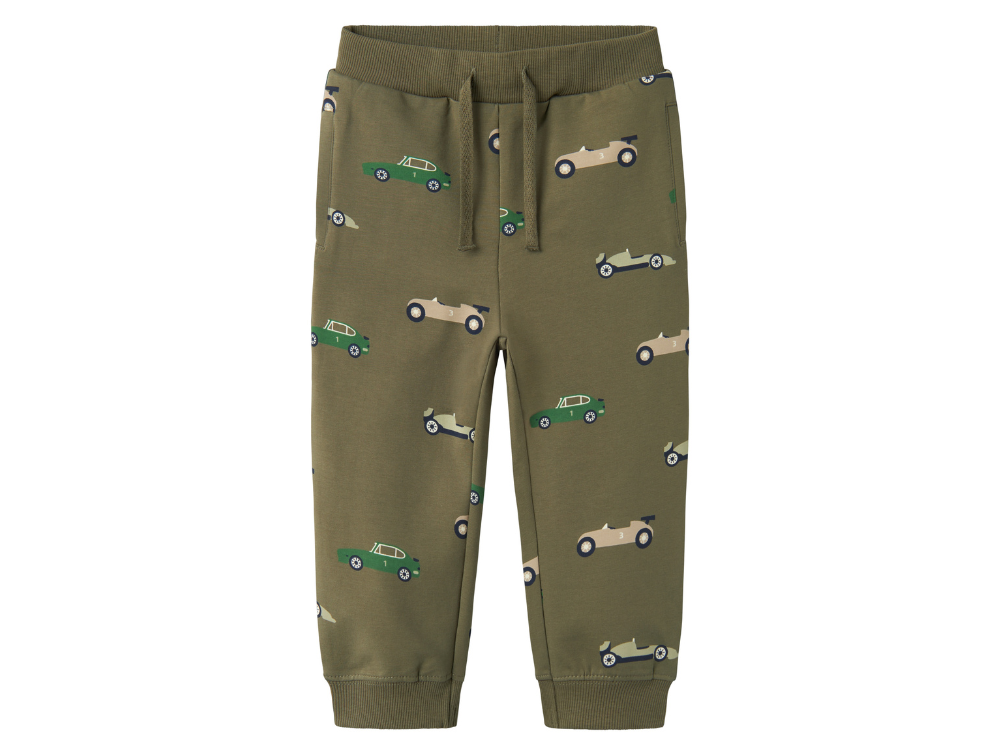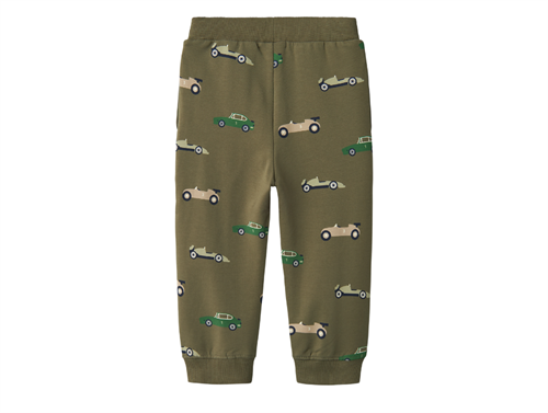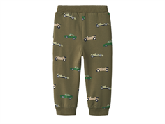 Sweatbukser i farven dusty olive med biler fra Name It.
