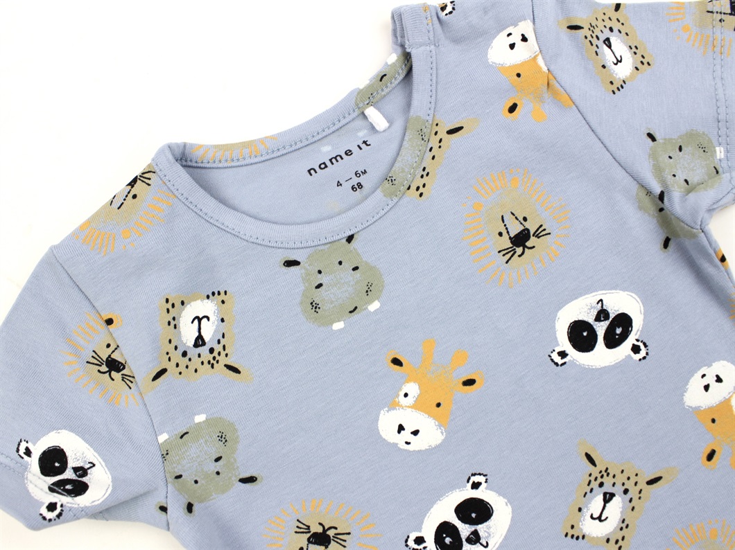 Blød kortærmet babydragt i farven dusty blue med print fra Name It.