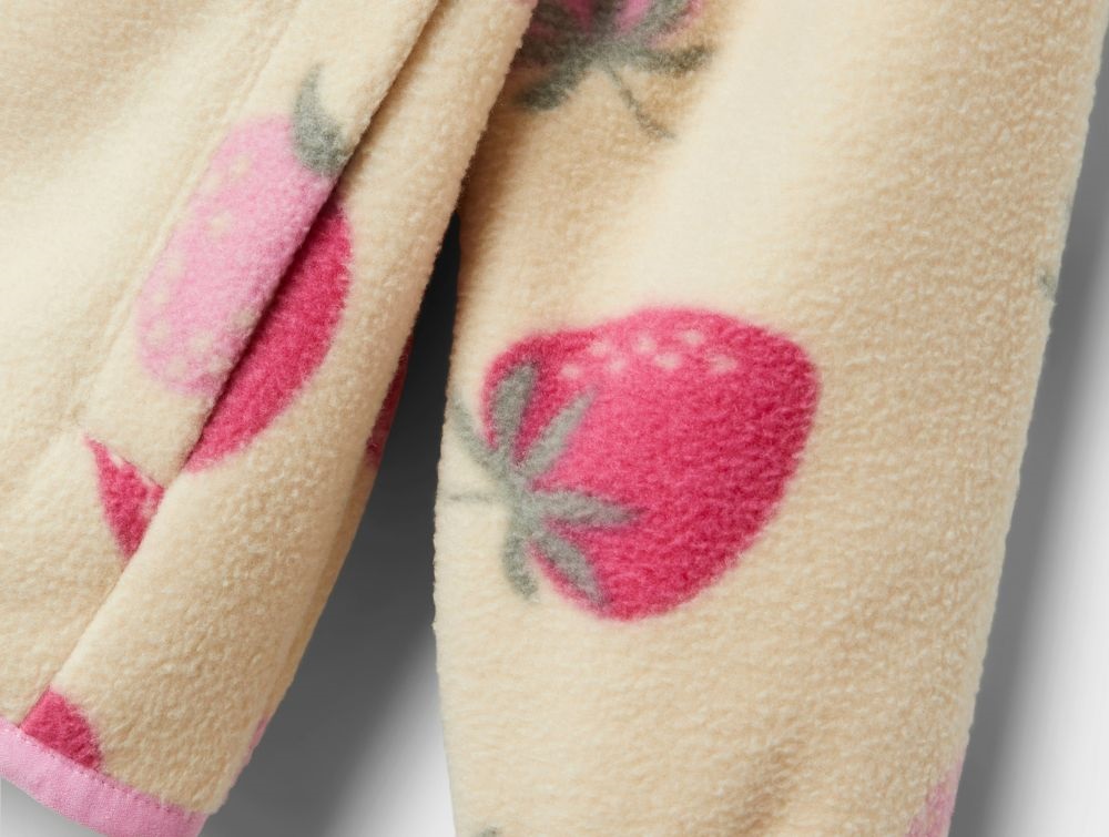 Den bløde fleecejakke har et sødt jordbærprint og kontrastfarvede kantbånd i pink. Jakken lukkes med lynlås og har to sidelommer, der gør den både praktisk og hyggelig til kølige dage.