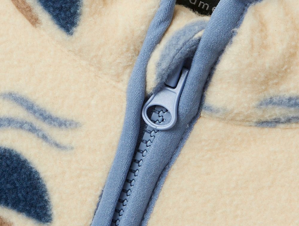 Den bløde fleecejakke har et fint print af skibe og kontrastfarvede blå kantbånd. Jakken lukkes med lynlås og har to sidelommer, der gør den både praktisk og hyggelig til kølige dage.