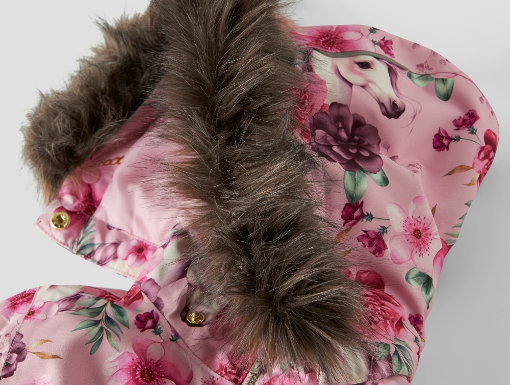 Flyverdragt i lyserød nuance (parfait pink) fra Name It med unicorn print og aftagelig hætte med syntetisk pelskant.