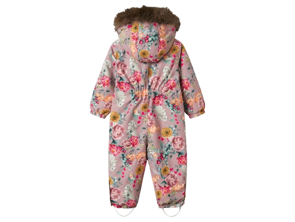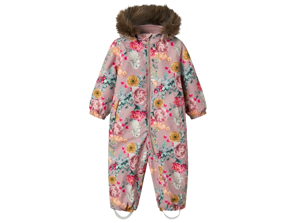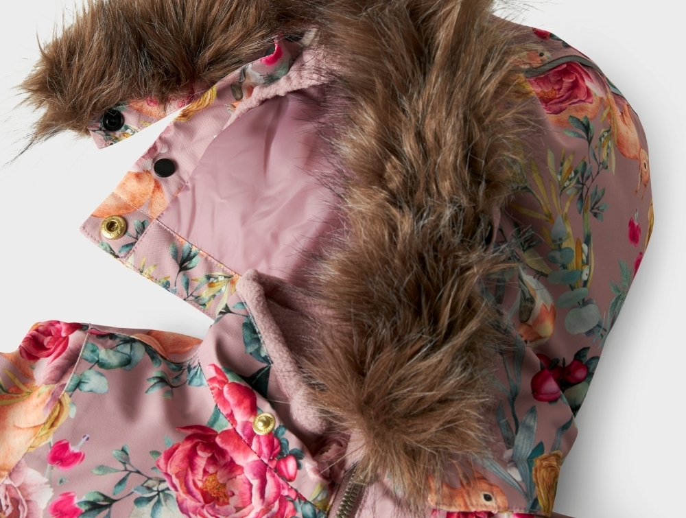 Flyverdragt i rosa violet nuance (woodrose) fra Name It med blomsterprint og aftagelig hætte med syntetisk pelskant.