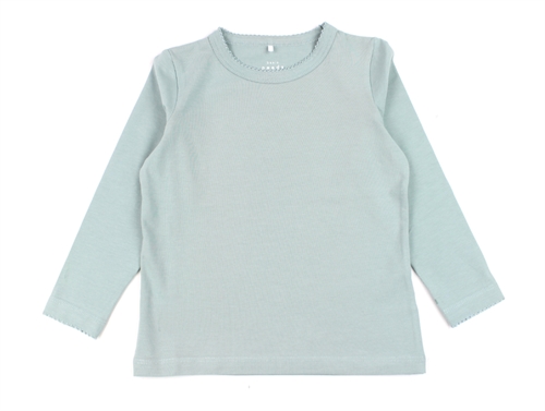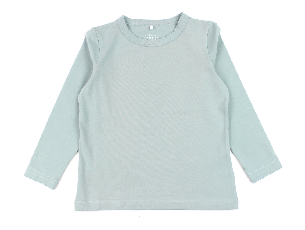 Langærmet top/bluse i farven gray mist med diskret blondekant ved hals og ærmeslut fra Name It.