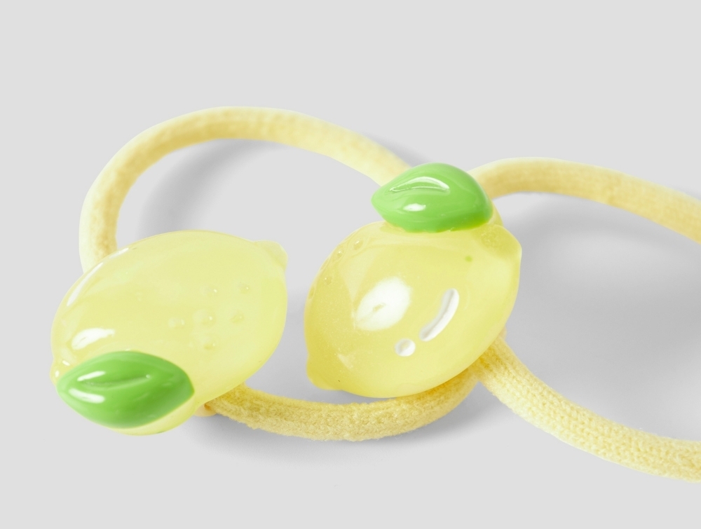 Hårelastikker i gul nuance (Lemonade) fra Name It med dekorativ citronformet detalje.