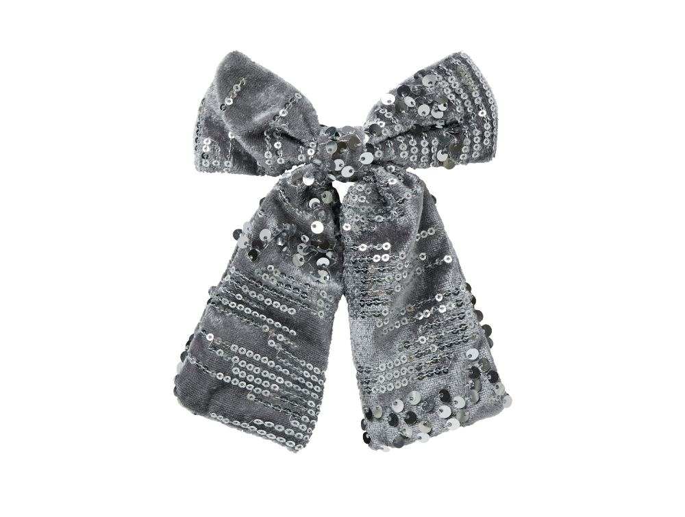 Hårsløjfe i grå nuance (lava smoke) fra Name It. Sløjfen er dækket af sølvfarvede pailletter, som giver et glitrende og elegant udtryk.