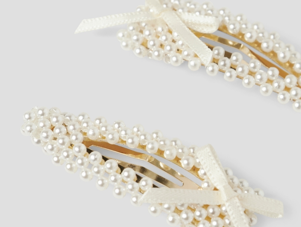 Sættet består af to spænder dekoreret med små perler og en fin sløjfe i satinbånd.