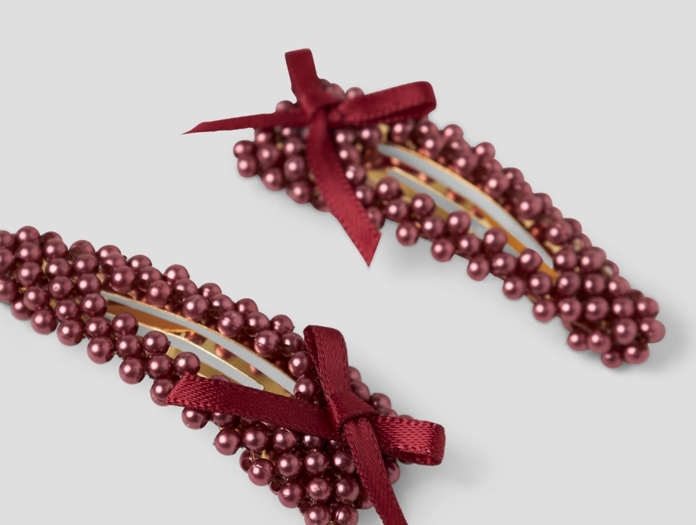 hårspænder i bordeaux fra Name It med perler og sløjfeDetaljebillede af hårspænder i bordeaux fra Name It med perler og sløjfe