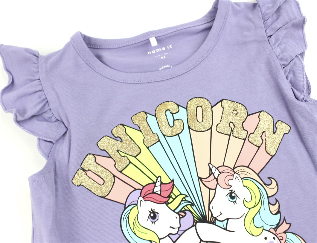 Kjole i farven heirloom lilac med My Little Pony-print og glimmer fra Name It.