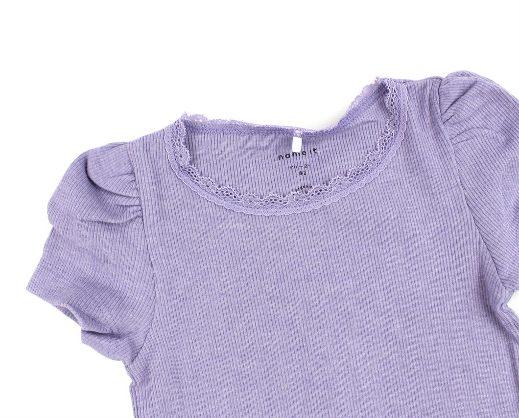Kortærmet top i farven heirloom lilac melange med blonde ved halsåbning fra Name It.